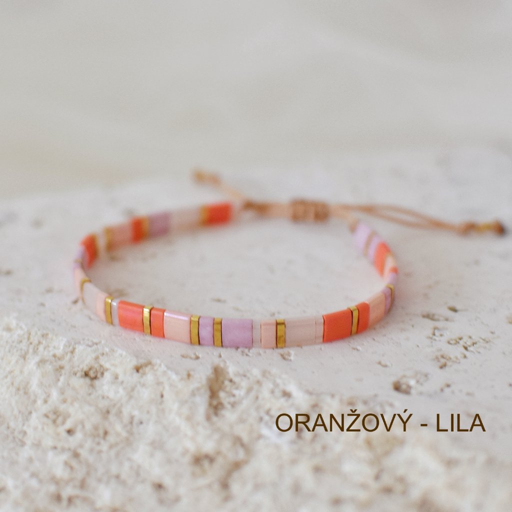 VAR. 2 Náramek Miyuki Tila lila oranžový + korálek Sluneční kámen 4 mm (SLUNEČNÍ KÁMEN je kámen radosti a ochrany)