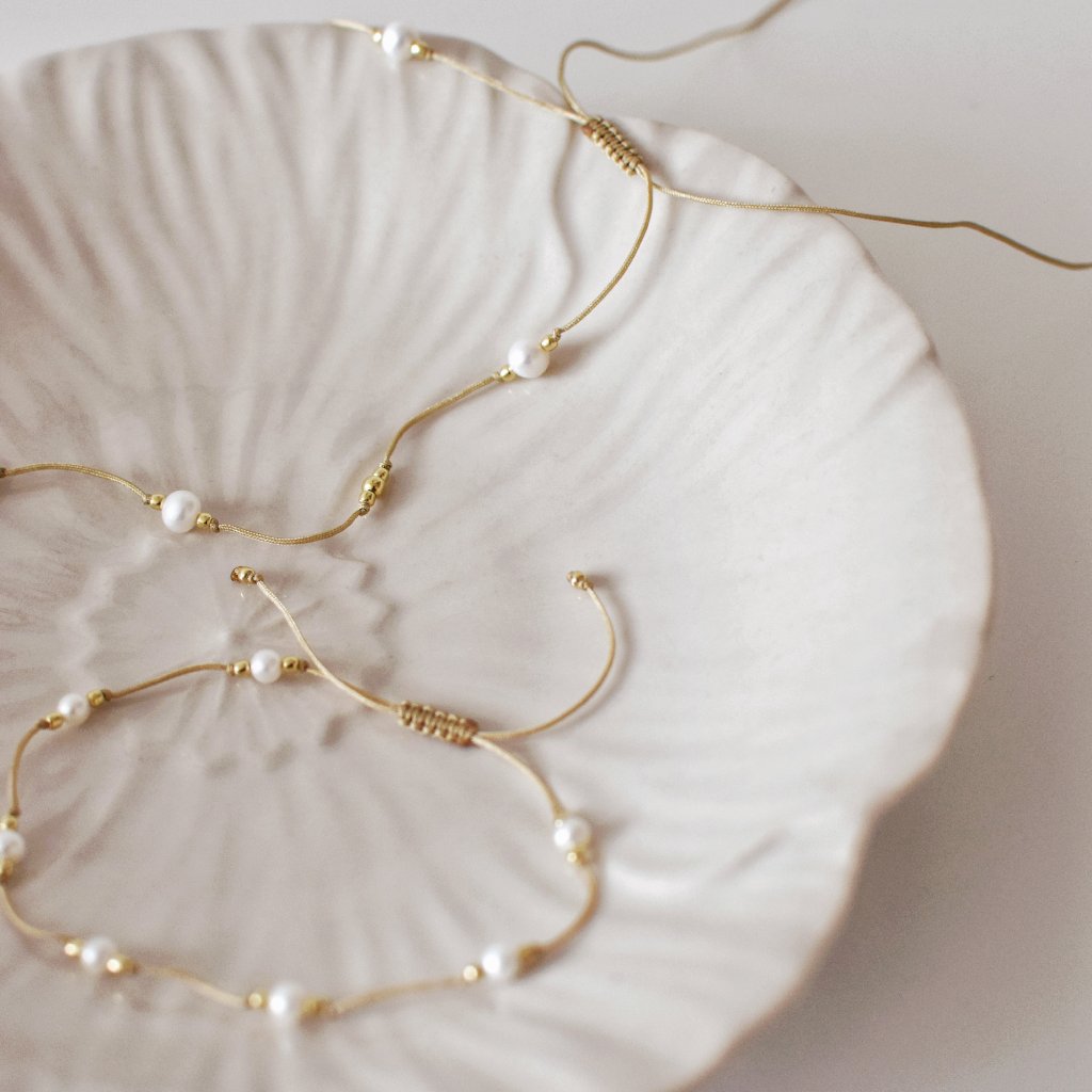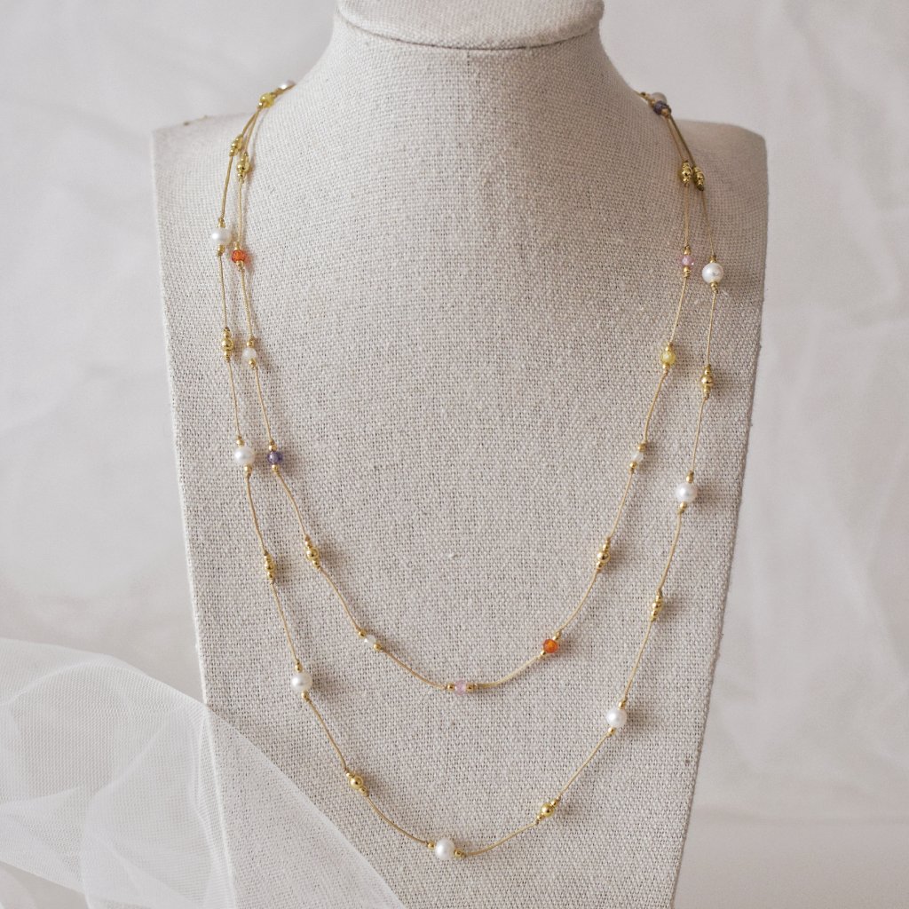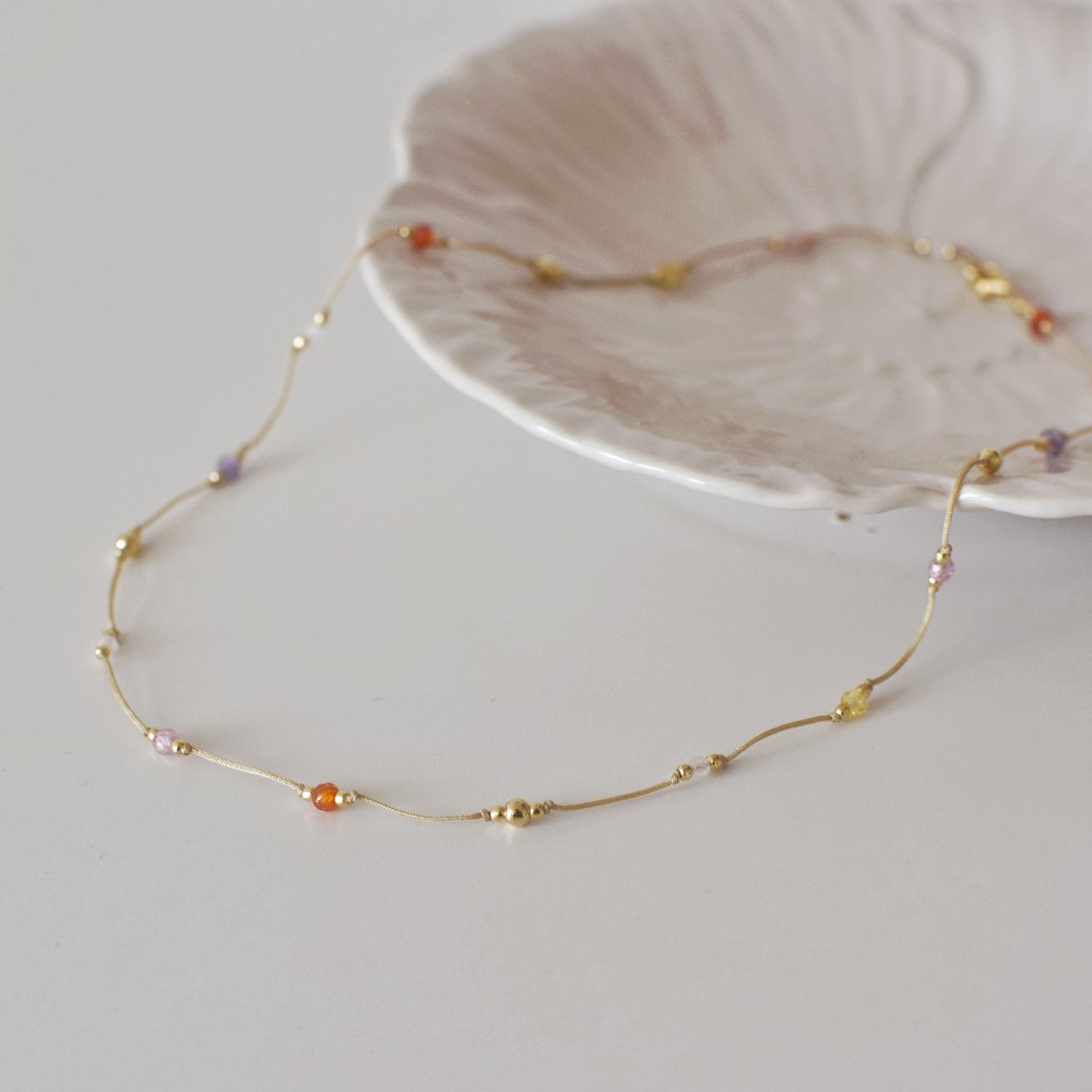 Péče: Světlá šňůrka může časem zajít (zašpinit se vlivem potu atd.). Náhrdelník vložím do namydlených rukou a pečlivě promnu. Poté umyju proudem vlažné vody a pořádně vysuším ručníkem.